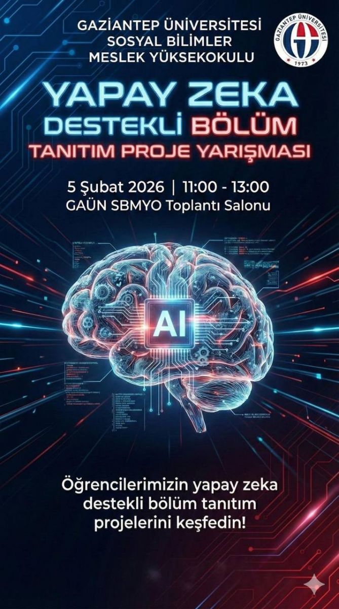 Sosyal Bilimler Meslek Yüksekokulu olarak, öğrencilerimizin yapay zekâ araçlarını kullanma becerilerini teşvik etmek amacıyla düzenlediğimiz “Yapay Zekâ ile Bölüm/Program Tanıtımı Proje Yarışması” başlıyor!